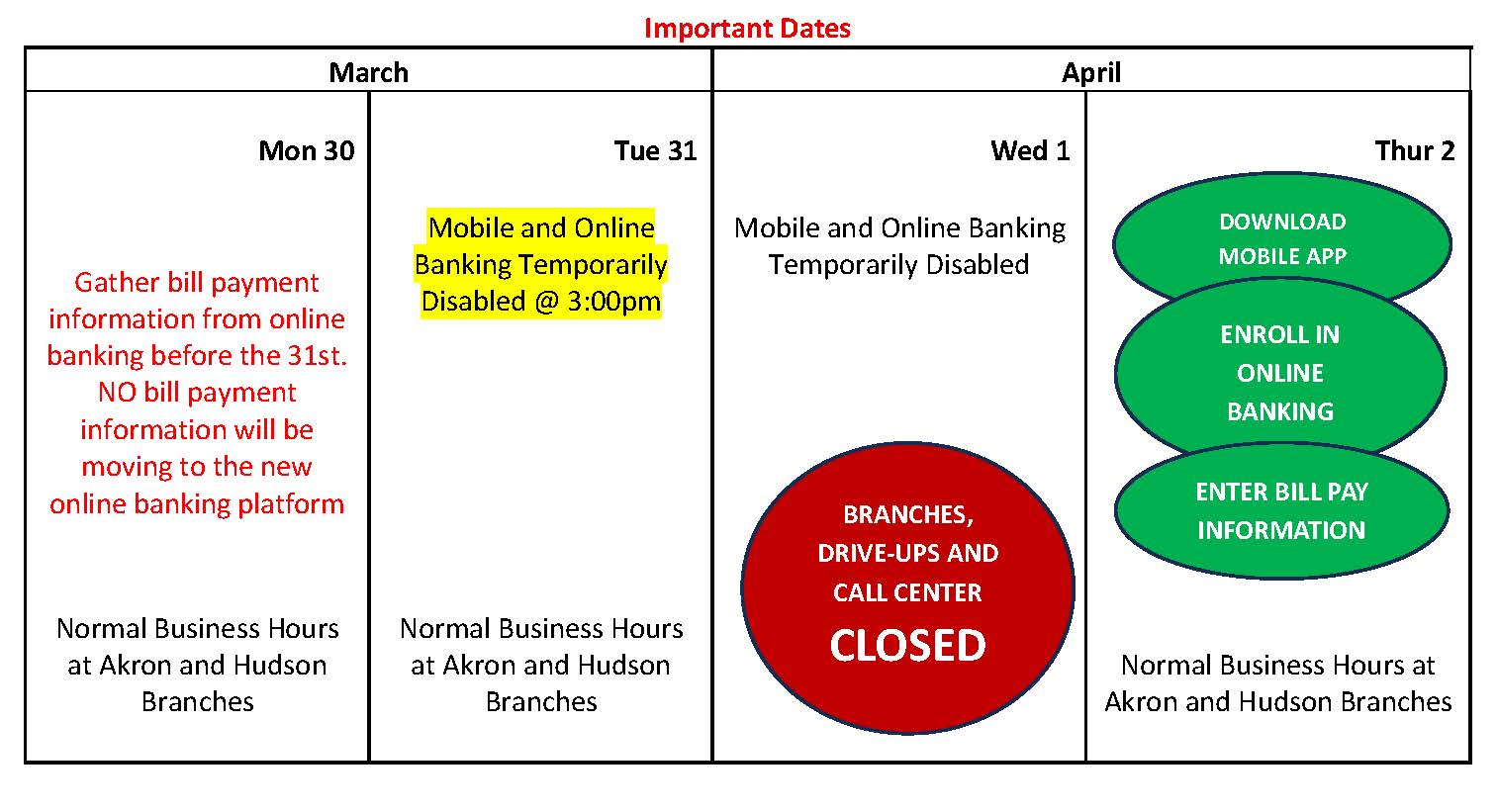 A: We will upgrade to the new system Wednesday, April 1, 2026. Because of the complex nature of the transition, our branches, drive-ups and call center will be closed on Wednesday, April 1, 2026.